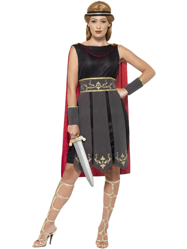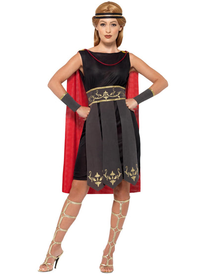 Roman Warrior Costume, Black, with Dress, Attached Cape, Arm Cuffs & Headband