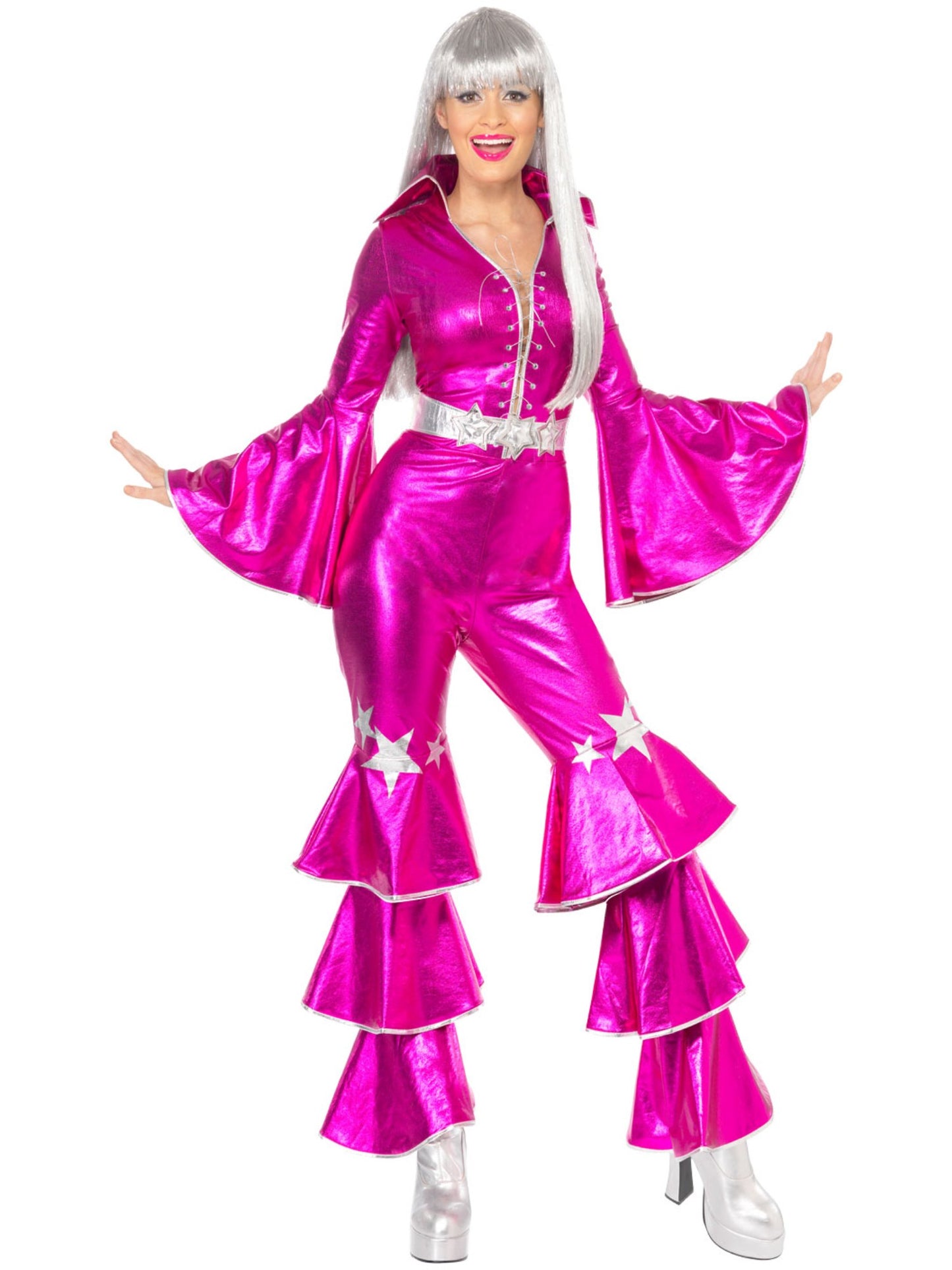 Transform into a dancing queen with our 1970's Dancing Dream Costume. This female seventies fancy dress costume includes a lace up jumpsuit.