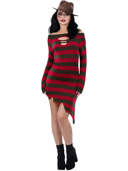 This must-have costume is perfect for turning up the heat this Halloween... Freddy Krueger style! The knitted dress provides an incredibly flattering fit, making it perfect for a Halloween night out. Get ready for a scary good time!