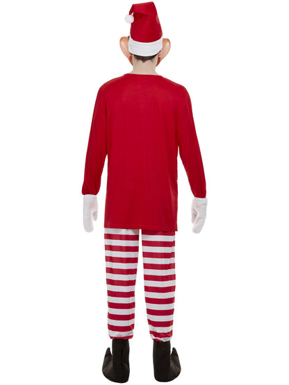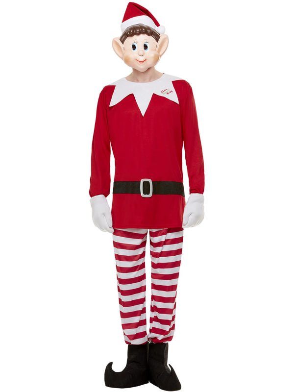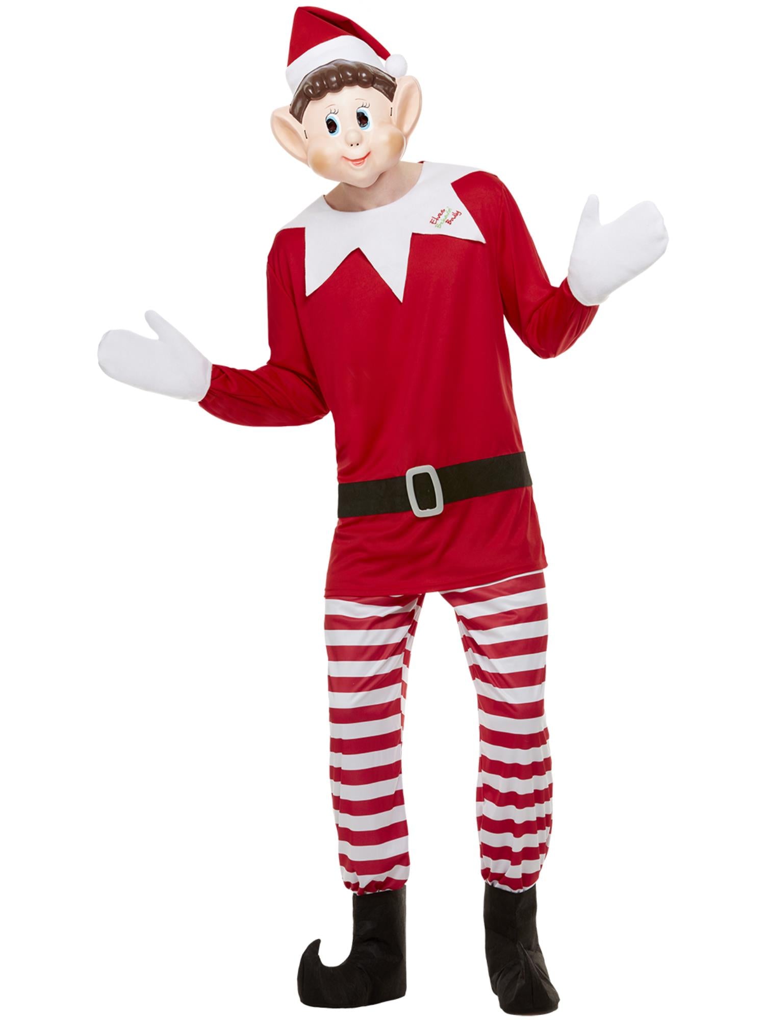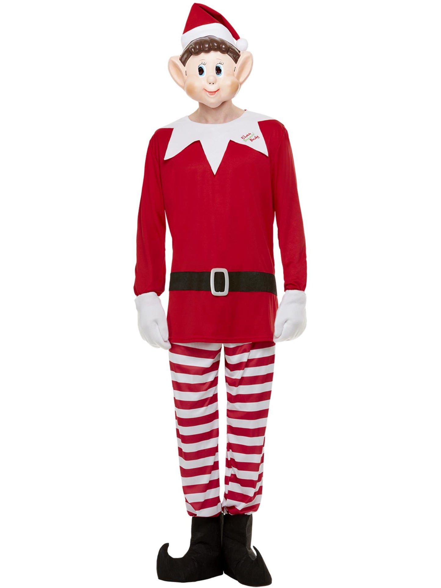 Elves Behavin' Badly Mens Elf Costume, Red & White, with Top, Trousers, Hat, Gloves, Bootcovers & Mask.