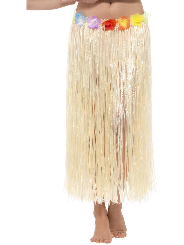 Hawaiian Hula Skirt with Flowers, Natural, with Velcro Fastening & Adjustable Waist Band
