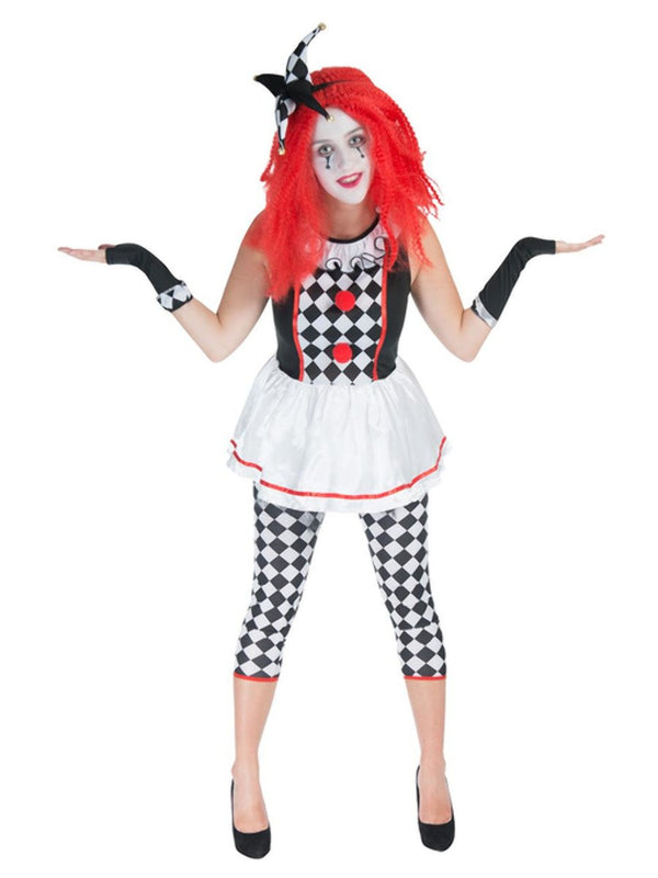 Ladies Clown Jester Costume, with Dress, Gloves, Leggings, and Headband.