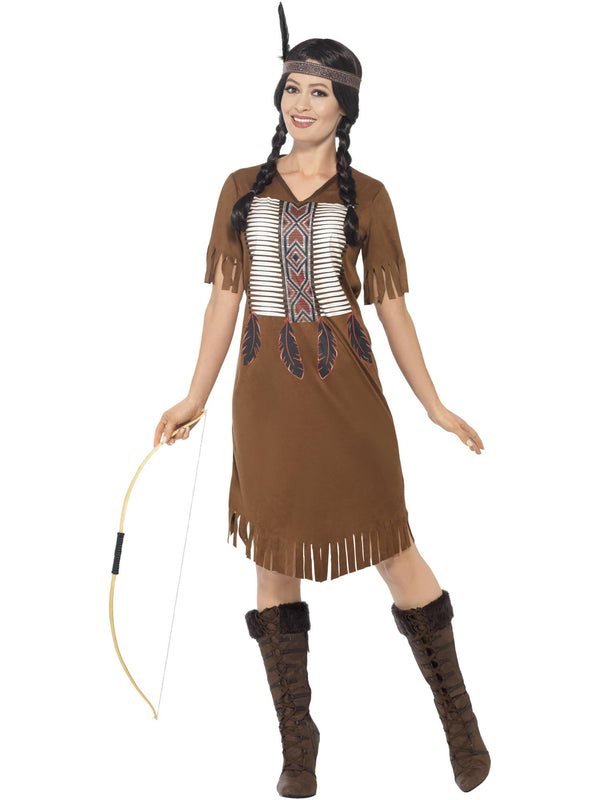This Women's Native Western Warrior Princess Costume is perfect for fancy dress parties. This costume includes a brown dress with a headband for a complete look. This costume is available Women's small, medium and large sizes.