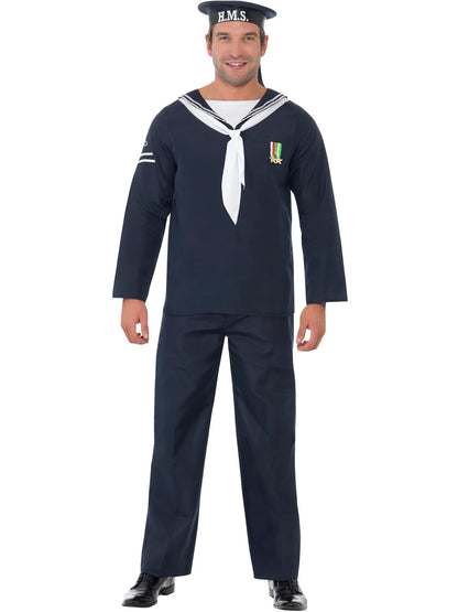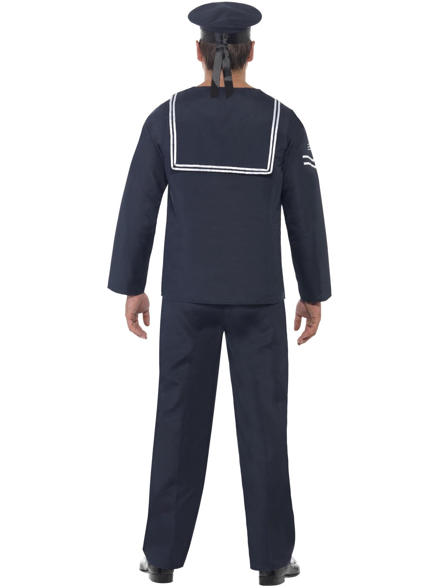 Get yourself kitted out to ride the waves in style in this 1940s Naval Seaman costume. We all know that everyone loves a sailor, so this outfit, which includes a top, trousers, and hat, is guaranteed to grab you some admiring glances! The navy-blue trousers have an elasticated waist, and the matching pull-on tunic-style top has long sleeves with printed white stripe detailing on the right sleeve and star-shaped medals on a colourful ribbon on the left breast. Complete with sailor-suit flap collar and white necktie detailing, this costume gives you an instantly recognisable character look. The included hat with the letters H.M.S printed in white on the front, and black ribbon-tail detailing at the back add another layer of naval seaman style. At the onset of WWII, the Royal Navy was the biggest in the world, so grab a little of the kudos in this easy to wear outfit, and give everyone a reason to love a man in uniform!