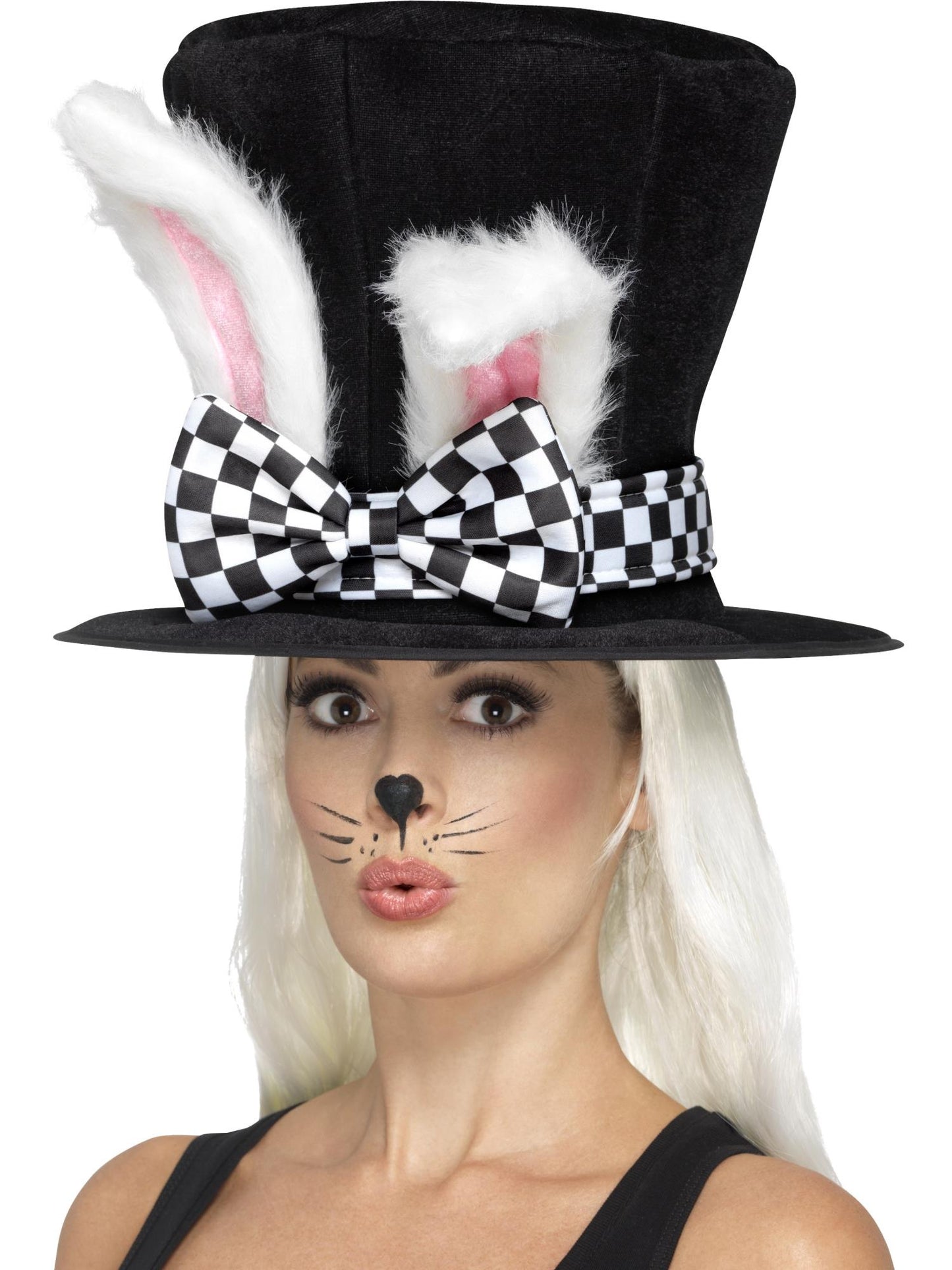 Tea Party March Hare Top Hat, Black & White, with Attached Rabbit Ears.