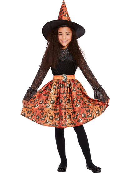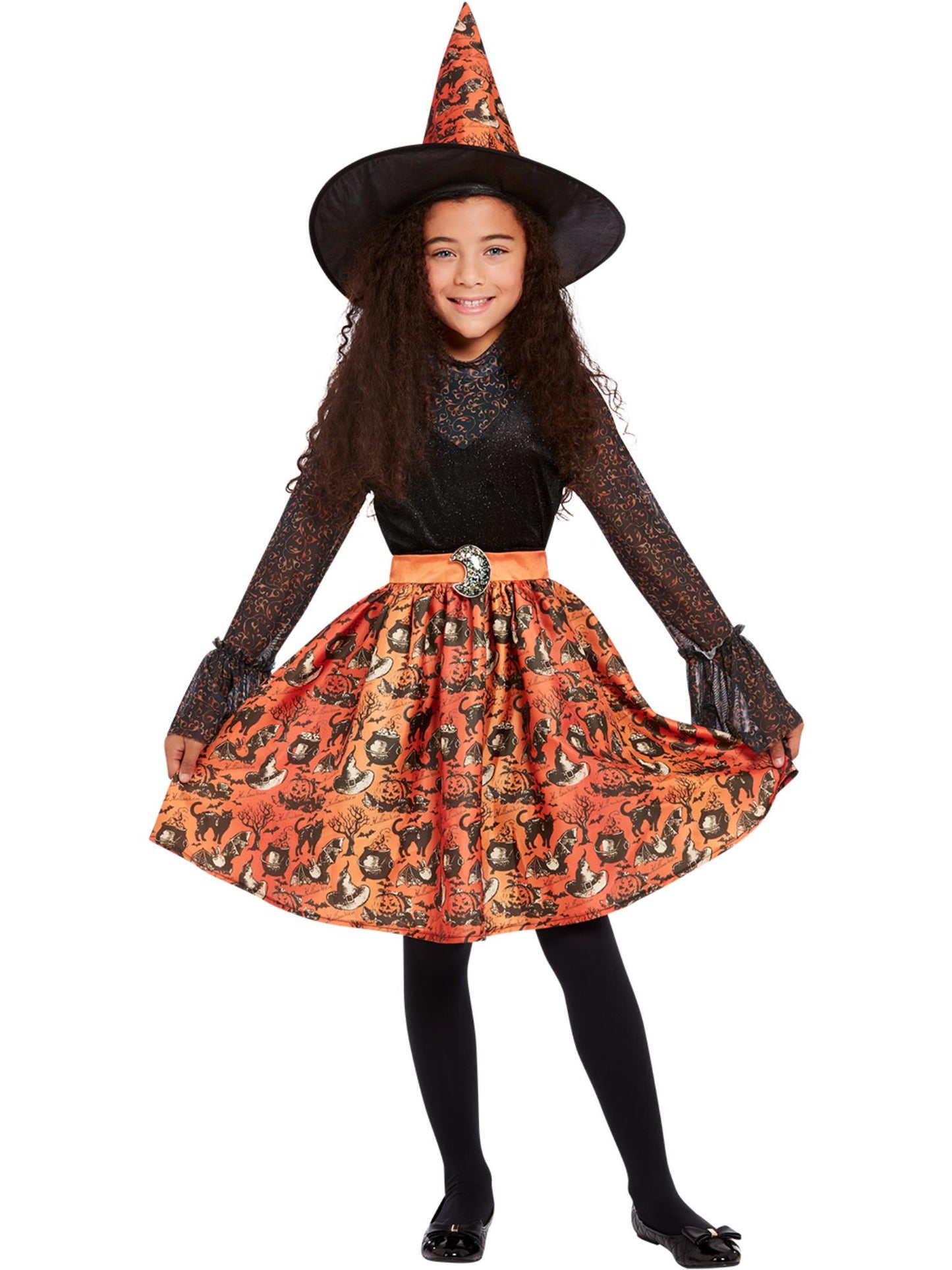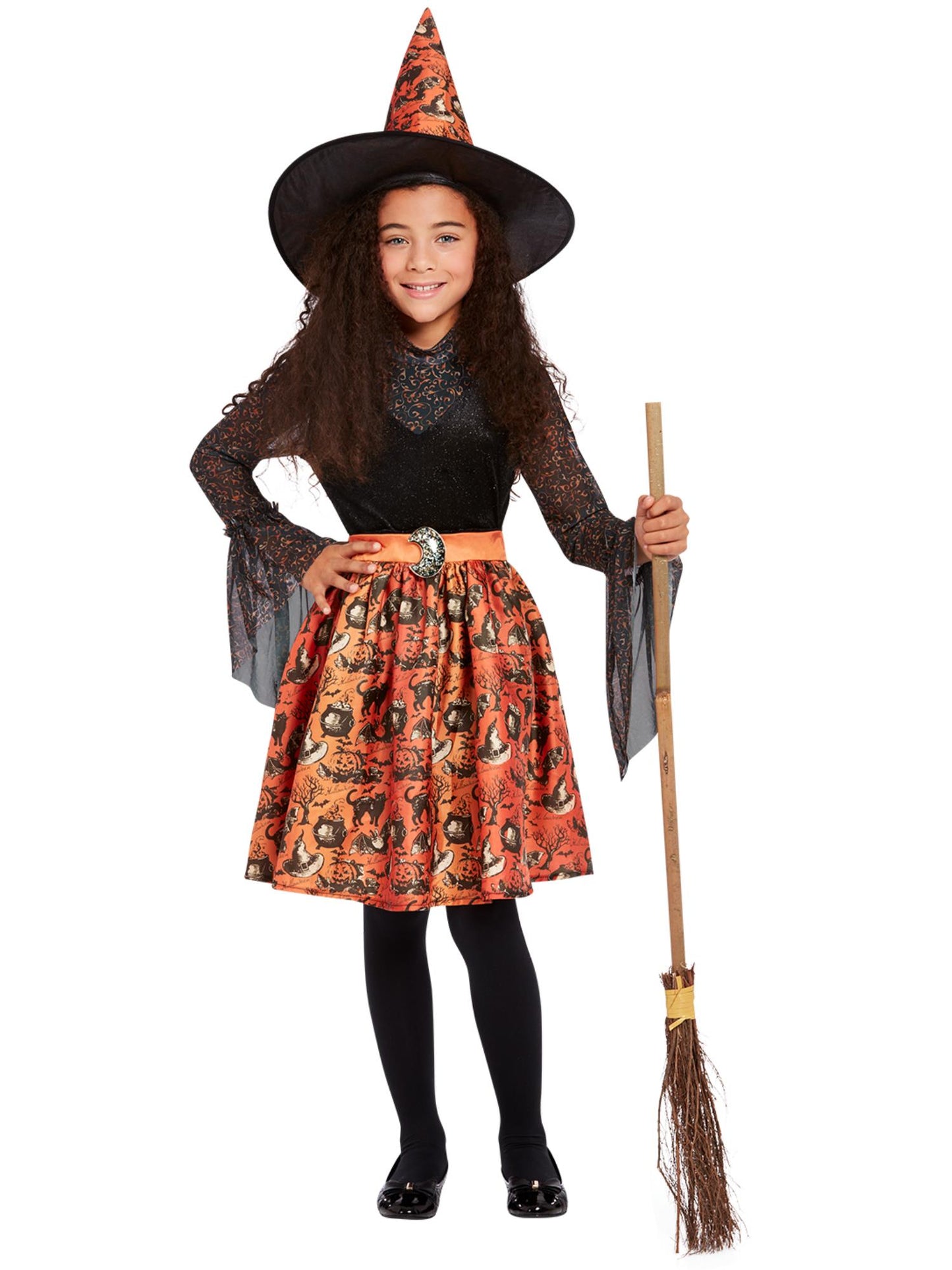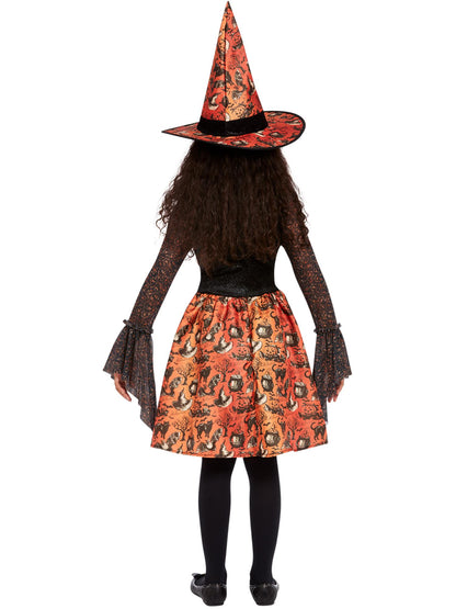Girls Vintage Witch Costume, Orange, with Dress and Hat.