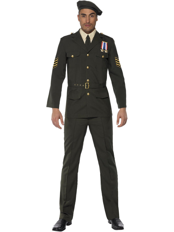 In this Wartime Officer costume, you get to be a wartime hero - even if it's just for a day! The outfit includes an army-green jacket, belt, trousers, tie, and a beret. The jacket has lots of fantastic detailing, including shiny buttons down the front, on the faux breast pocket flaps, and shoulder epaulettes. Embroidered stripes feature on both sleeves, and embroidered star medals with red, white, and blue ribbons on the chest give the true hero look. The included green beret provides the perfect finishing touch, giving you an instantly recognisable costume that's great for 1940s or wartime-themed parties. Just add a smart shirt and some shiny shoes and you're good to go - and get ready for some admiring glances whenever you walk into a room!
