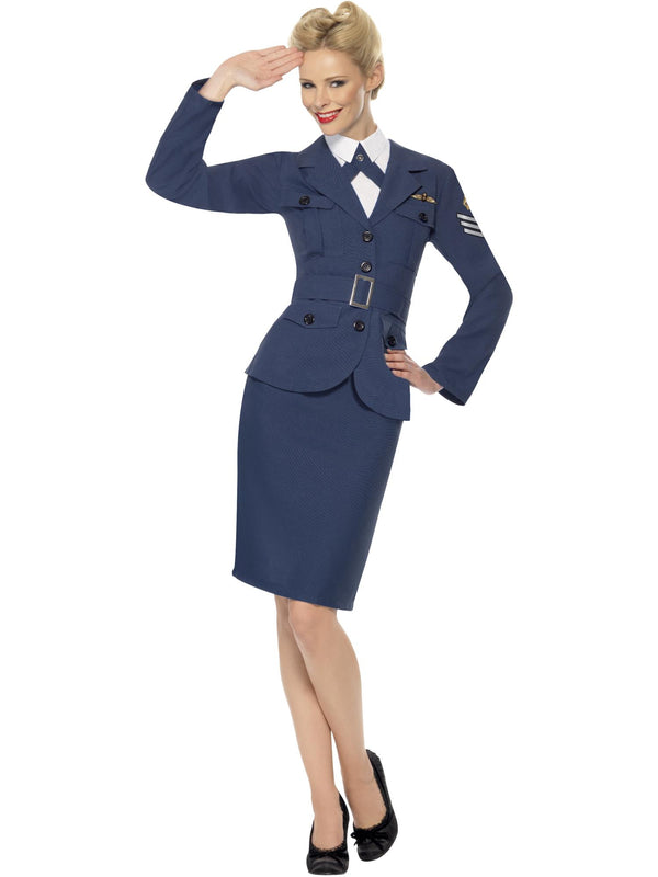 Chocks away in this fabulous WW2 Air Force Female Captain costume! Dress up in this outfit and you get to be both a super-efficient wartime hero and a super-sexy wartime pinup! The costume includes an air force-blue jacket with belt, skirt, and mock shirt with tie. The jacket is shaped to create a feminine outline with the belt fastening neatly at the waist. Faux pocket flaps and black buttons feature on the front, and printed stripes and and a crown insignia feature on the left sleeve. RAF-style wings are worn proudly above the left chest pocket to give the true 'woman-of-action' look, with the mock shirt and tie keeping the whole imagine neat and tidy in true 'woman-of-the-1940s' style. The just-above-the-knee-length pencil skirt can be paired up with your favourite comfy shoes so that you're ready to report for duty, or a pair of high-heels for the 'come fly with me' pinup look - depending on the occasion! Why not complete the wartime image with a 1940s sweetheart wig (available separately)? Be captain of the skies, be stylish, be fun, and be ready for some admiring glances whenever you touch down!