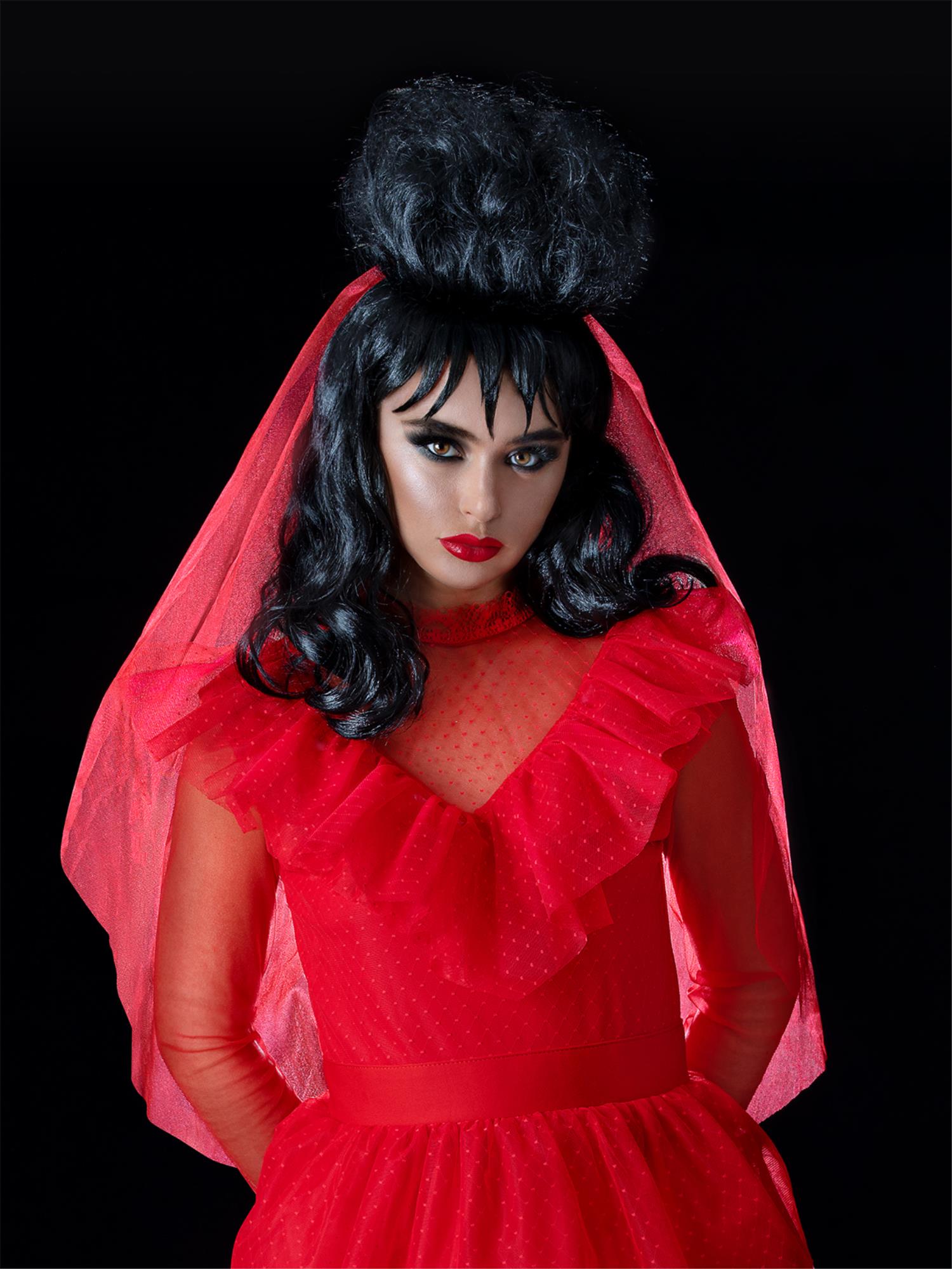 Make an unforgettable entrance as Lydia Deetz with this Beetlejuice-inspired costume wig. With long jet-black hair, fringe and that infamous up-do, it captures her goth-girl look and ready for any bride-to-be transformation. Perfect for Halloween and other themed parties.