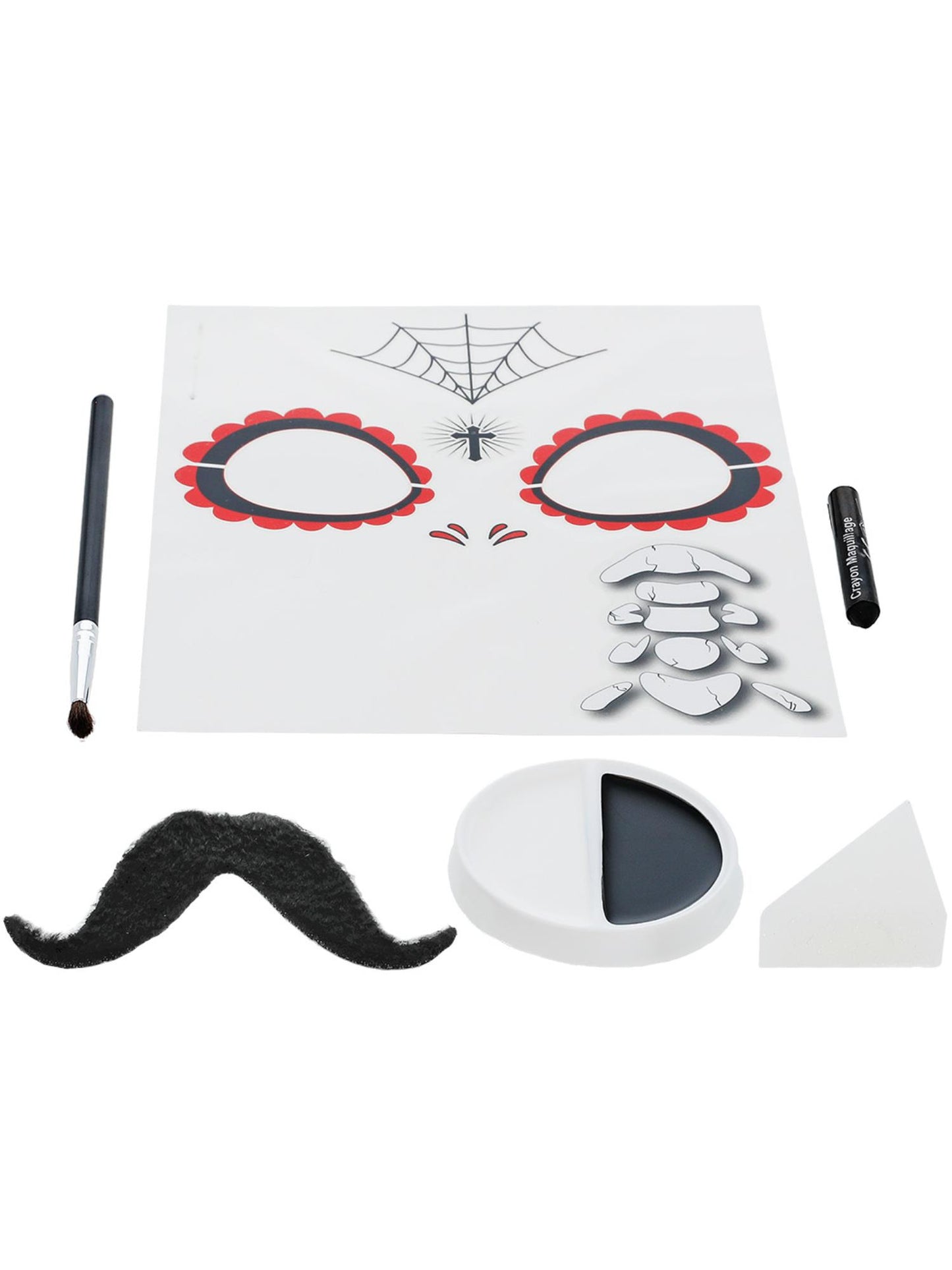 This Day of the Dead Senor Bones Make-Up Kit is perfect for adding the finishing touches to your scary Day of the Dead Costume. This kit includes black and white transfers, face paint, pencil, moustache and applicators.