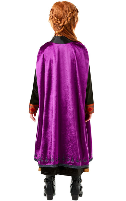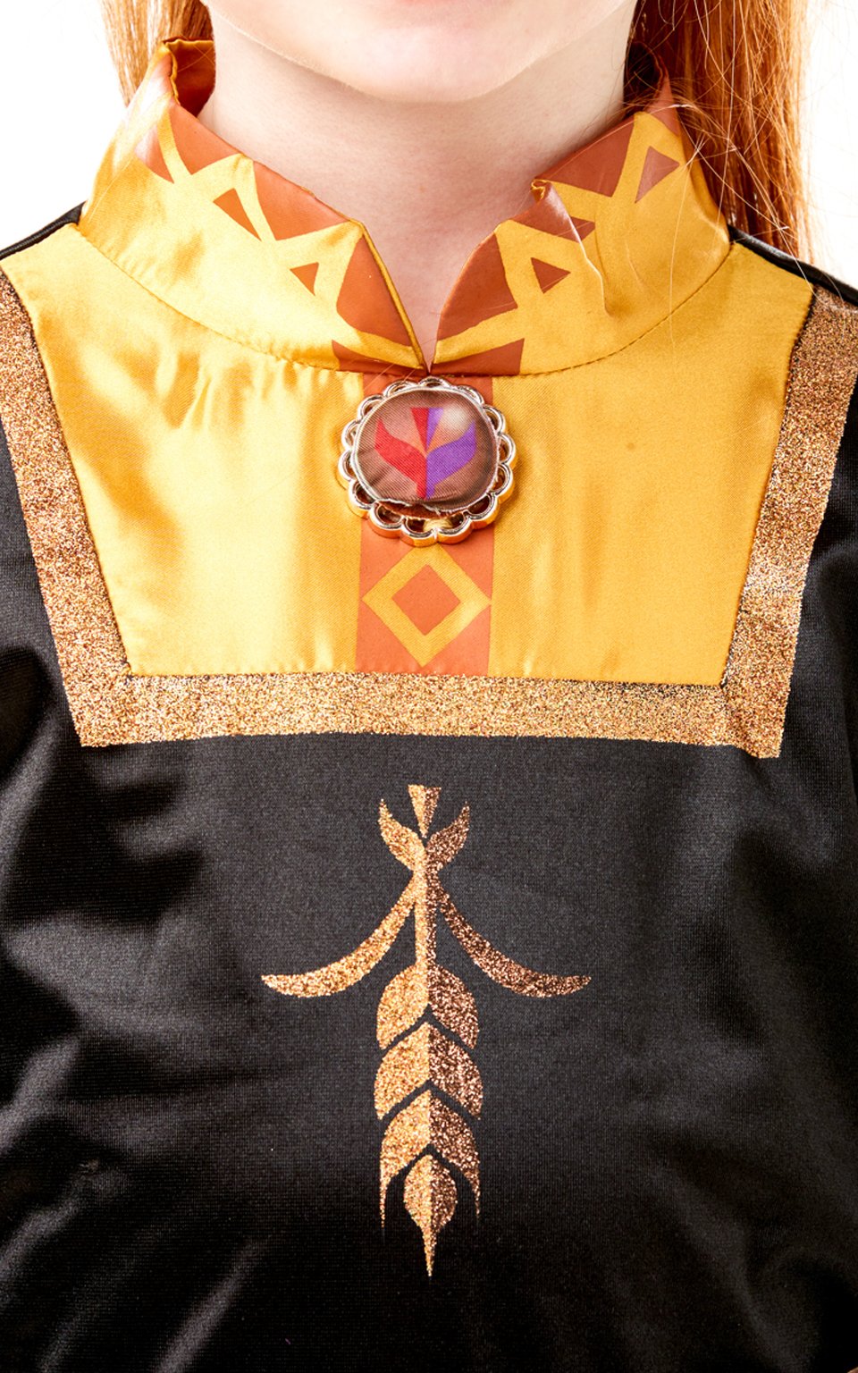 Fans of Disney’s ‘Frozen’ can become queen for a day – or as many days as they choose – when they dress up in this officially licensed Anna costume. Just like in the film, the outfit includes a long-sleeved dress, a half belt, and a long cloak (boots not included). The ankle-length black dress is beautifully decorated with gold and glittery folklore-inspired designs, and has a colourful printed mock blouse with a stitched-on brooch and high neck. The long sleeves have colourful printed cuffs, and the detachable brown half belt with leather-effect ties fastens onto the dress waistline with Velcro. The dress fastens at the back with Velcro and has a glittery printed panel-effect and matching hemline. The sleeveless long cloak has a luxurious velour feel and is purple with a pink trim at the edges and glittery printed design around the bottom. It fastens at the neck with two 3D buttons and a fabric braid, and slits in the front panels provide arm holes. Perfect for swirling and singing, and embarking on adventures in enchanted forests!