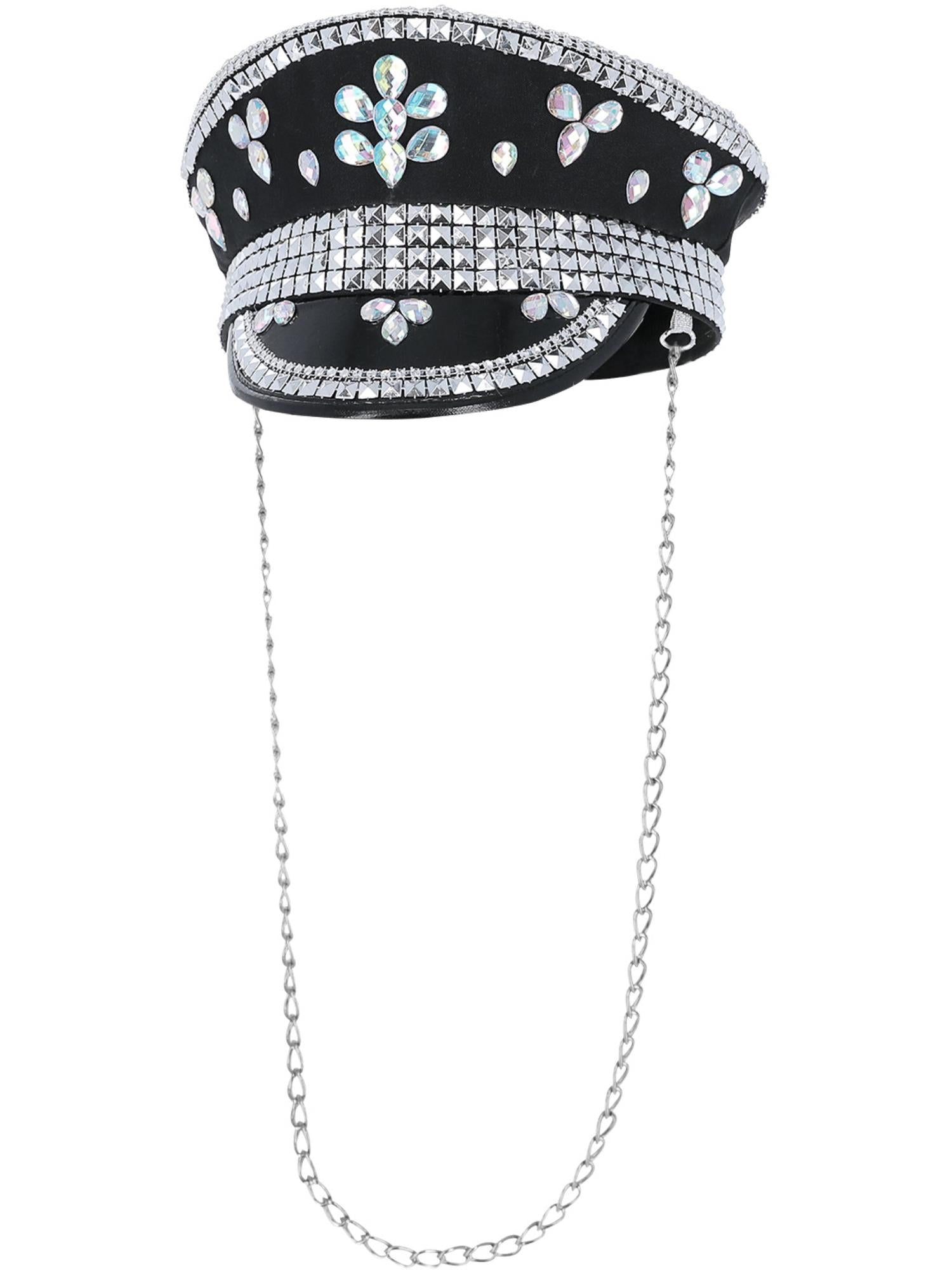 Fever Deluxe Sequin Studded Captains Hat, Black, with Chain