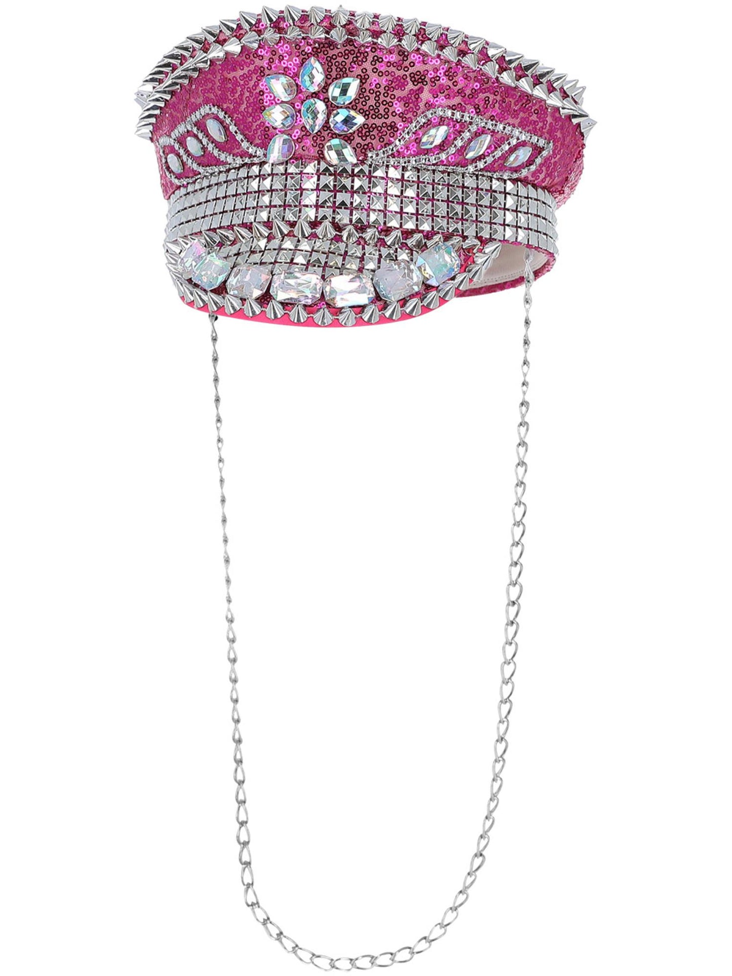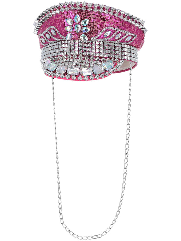 Fever Deluxe Sequin Studded Captains Hat, Hot Pink, with Chain