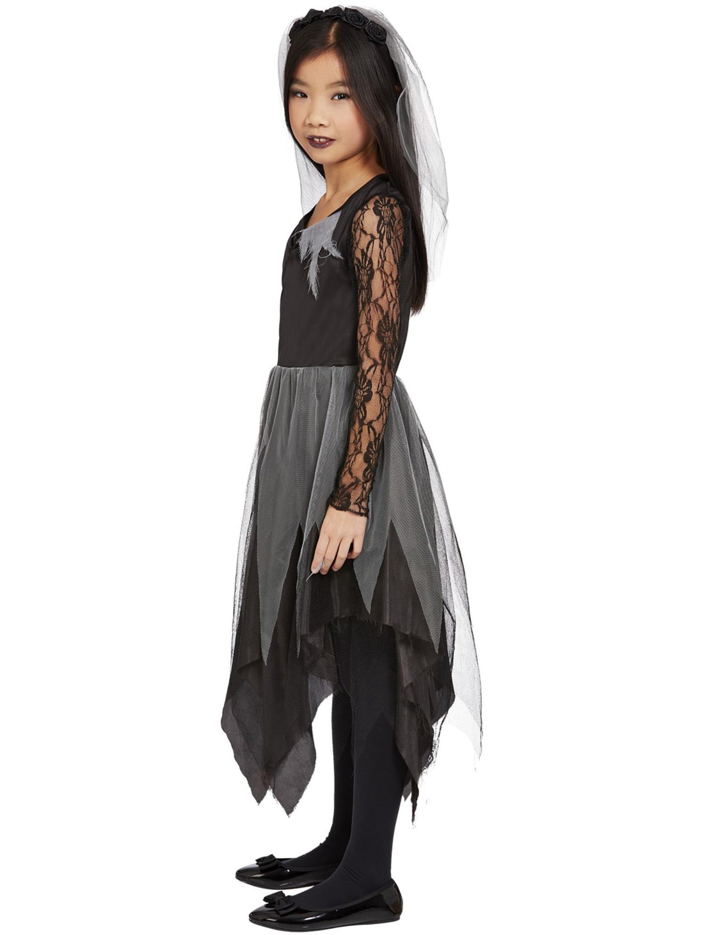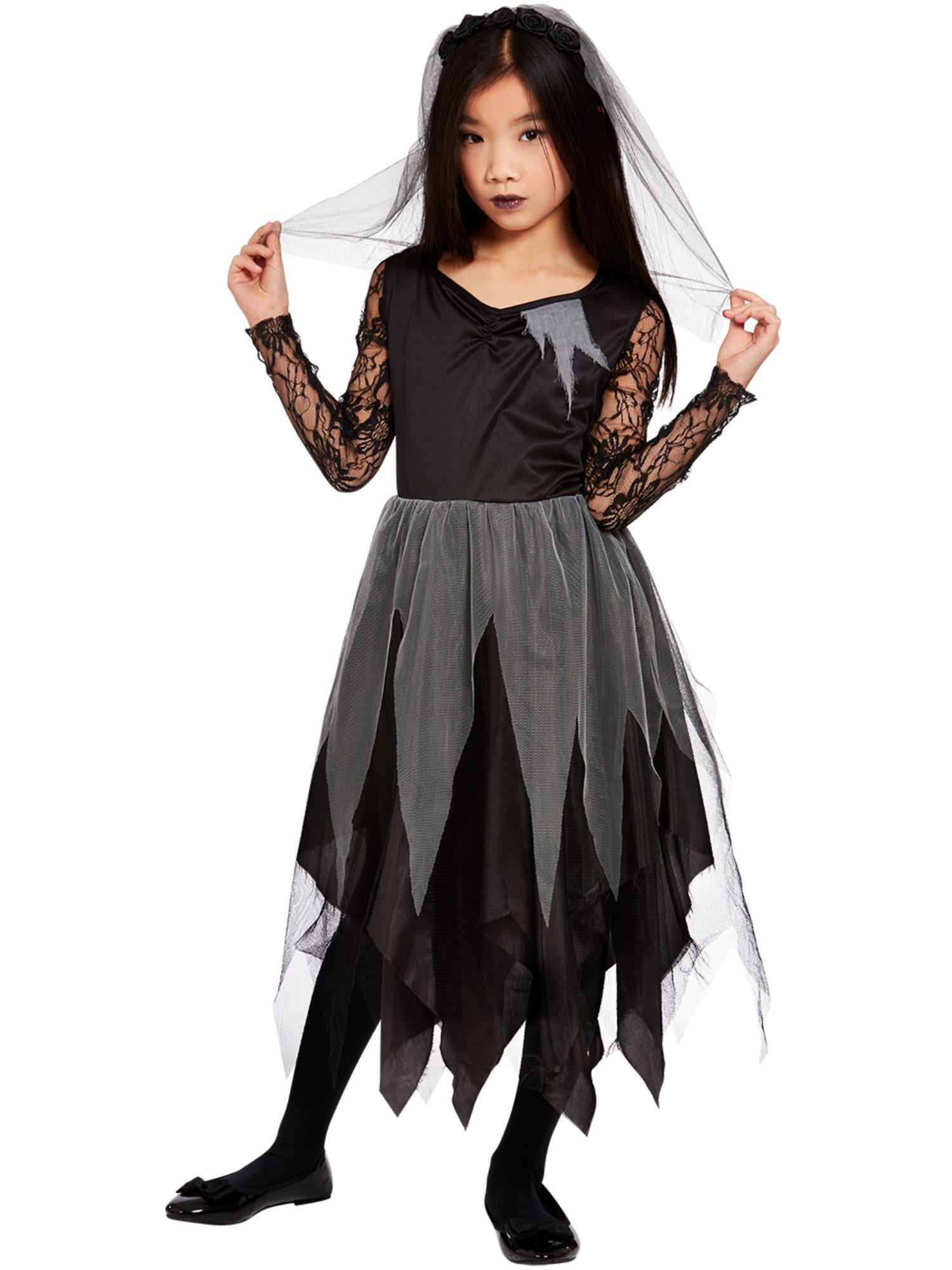 Girls Black Graveyard Bride Costume, Black, with Dress and Veiled Headband.