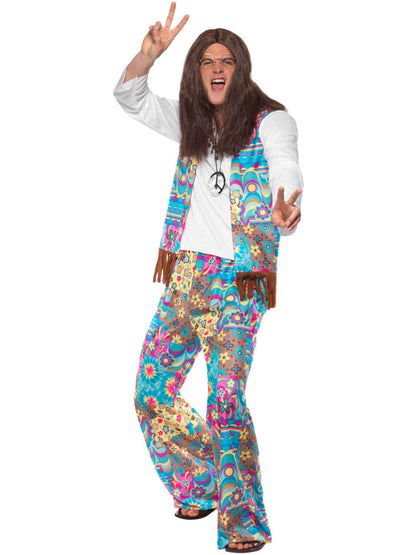 Look totally groovy in our Groovy Hippie Costume. This male sixties fancy dress costume includes a top with attached waistcoat, trousers and headband. This fancy dress costume will have swinging back to the sixties in no time!