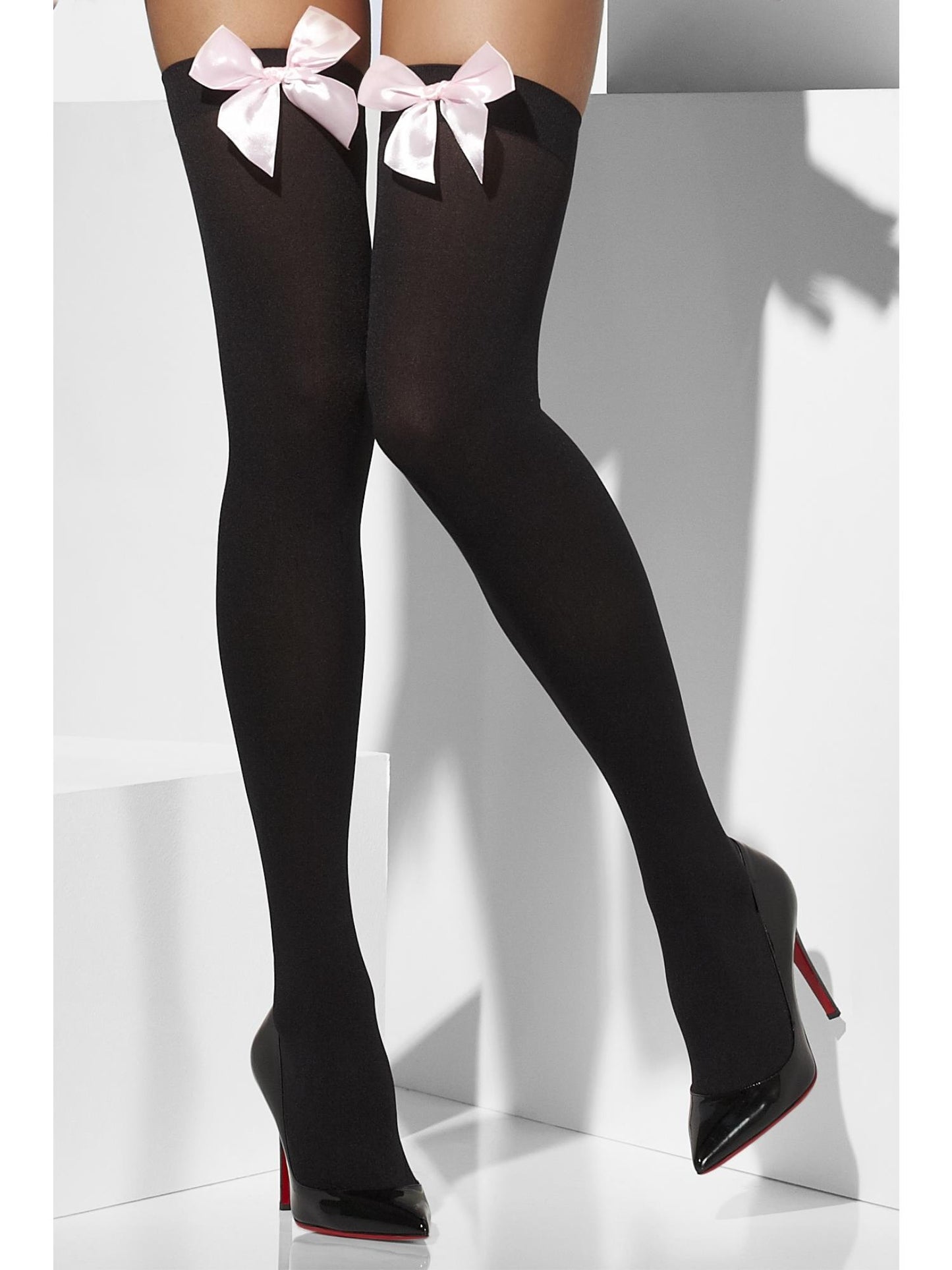 Add the perfect touch to your dress-up outfit with the Black Sheer Hold-Ups. The sexy hold-ups feature gorgeous pink bows. They'll definitely add the heat to your outfit. Perfect for a party.
