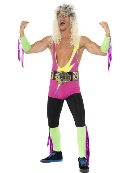 Retro Wrestler Costume, Multi-Coloured, with Bodysuit, Belt, Arm & Leg Cuffs