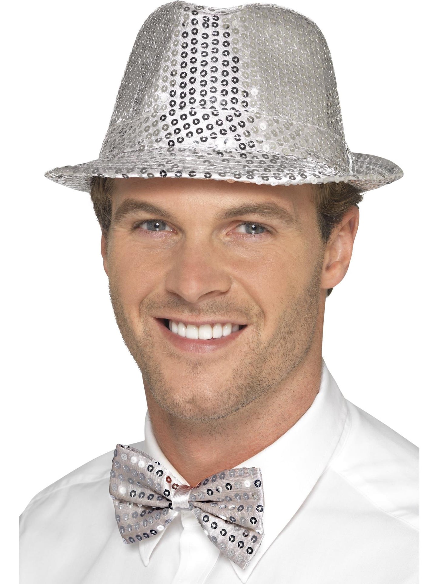 Both men and women can dazzle in the silver sequined trilby hat. Available in one size only, this accessory is sure to get you noticed at the party.