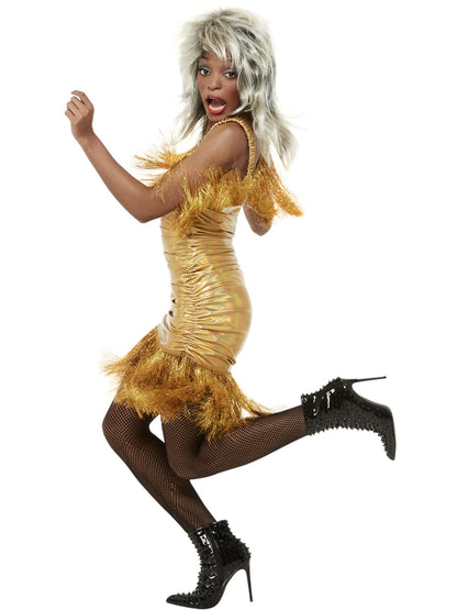 Get yourself into full-on diva mode in this gorgeous Tina-tastic Simply the Best costume. The stretchy gold satin-effect mini-dress has fabulous tassels around the neckline and hemline, an elastic shoulder strap on one side, and a zip fastener down one side seam. Designed for shimmying and strutting your stuff, this outfit is perfect for Tina fans, and while we can't guarantee it'll give you her amazing singing voice, we can say for sure it'll make you look simply fantastic! Why not add to the look with a Tina-style wig (available separately)? (Tights and ankle boots not included).