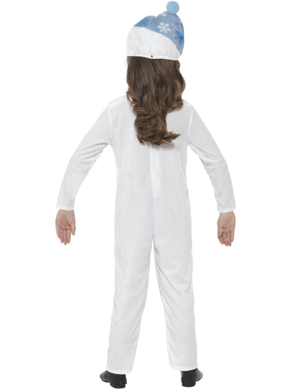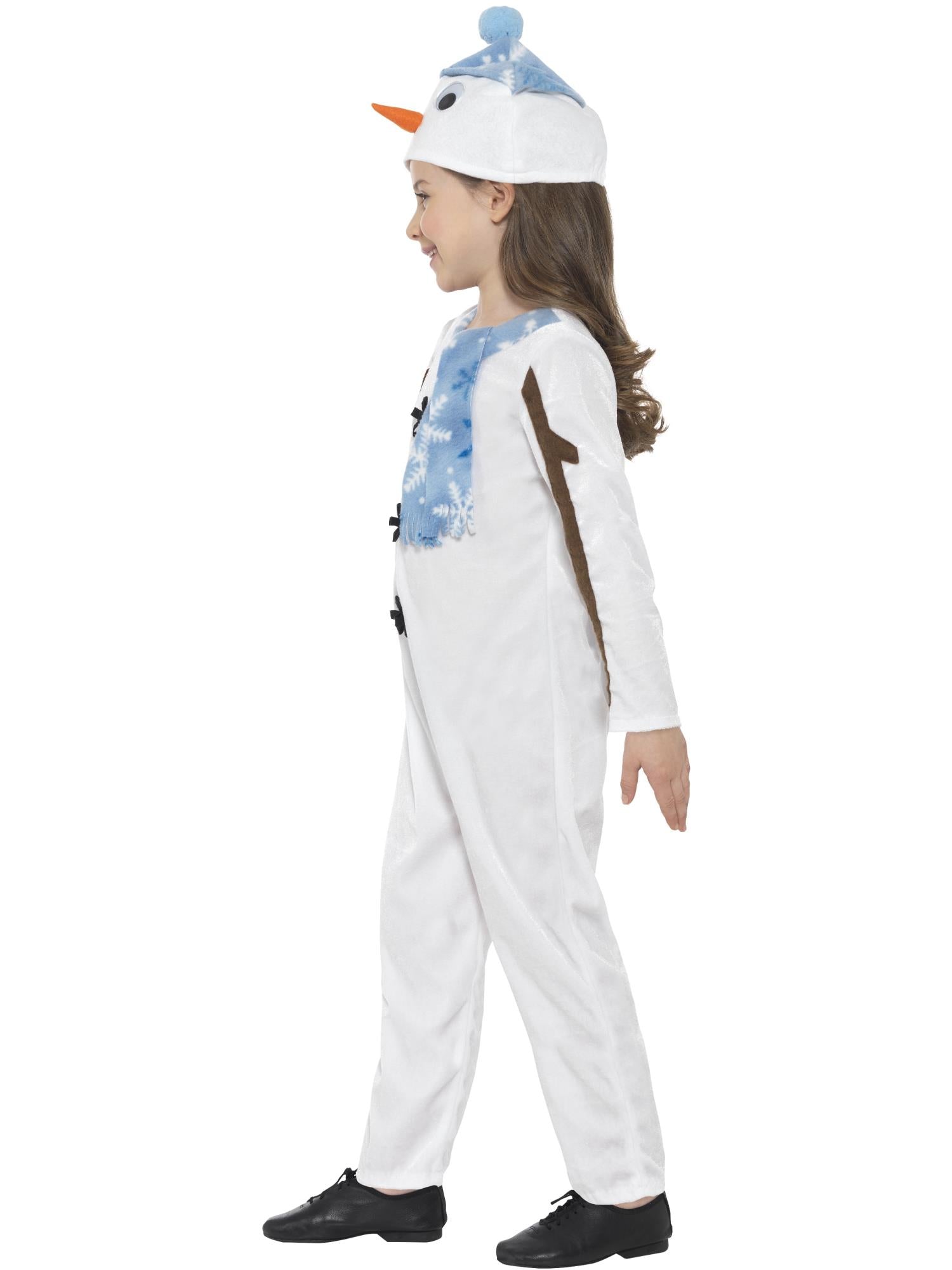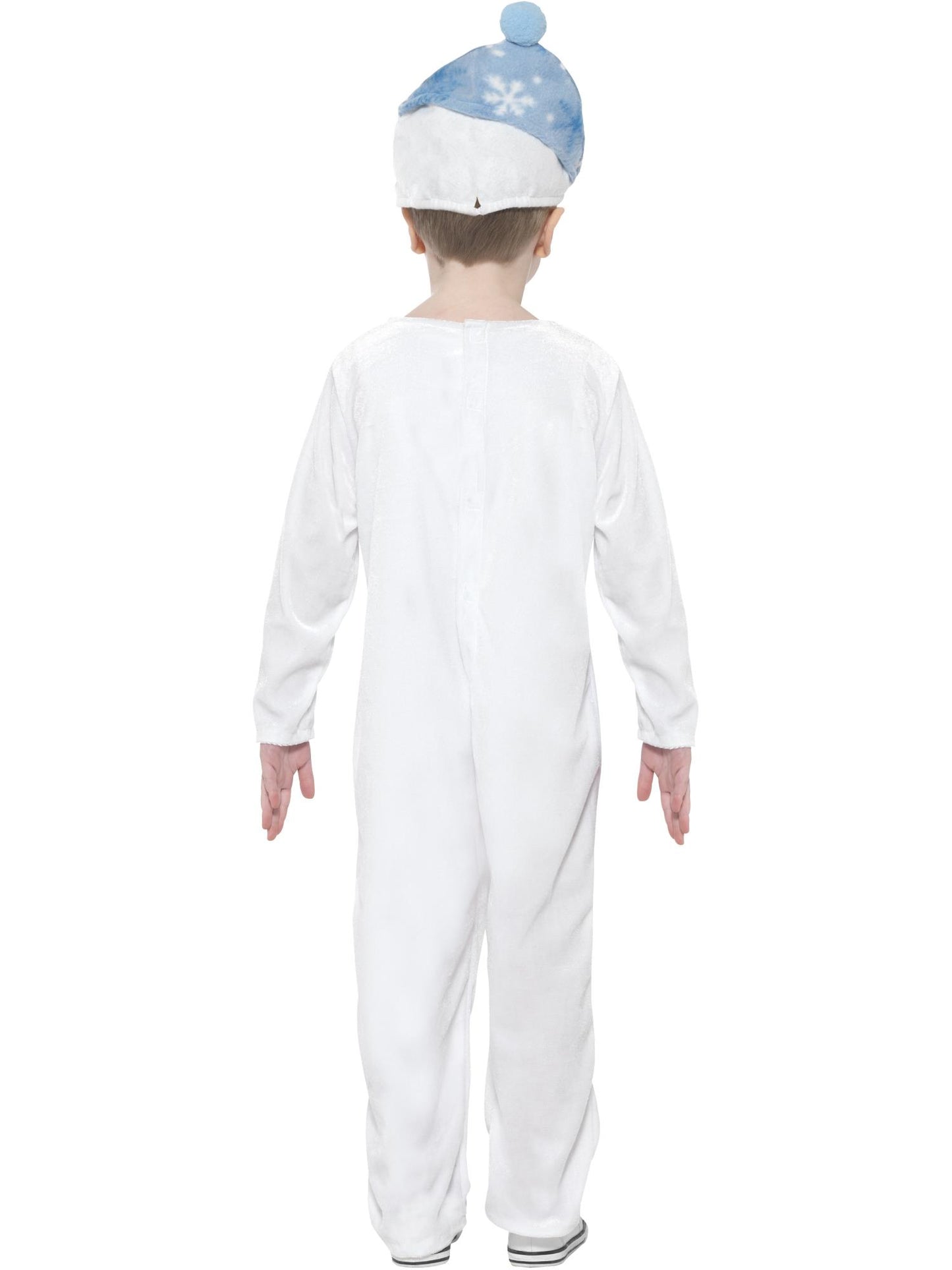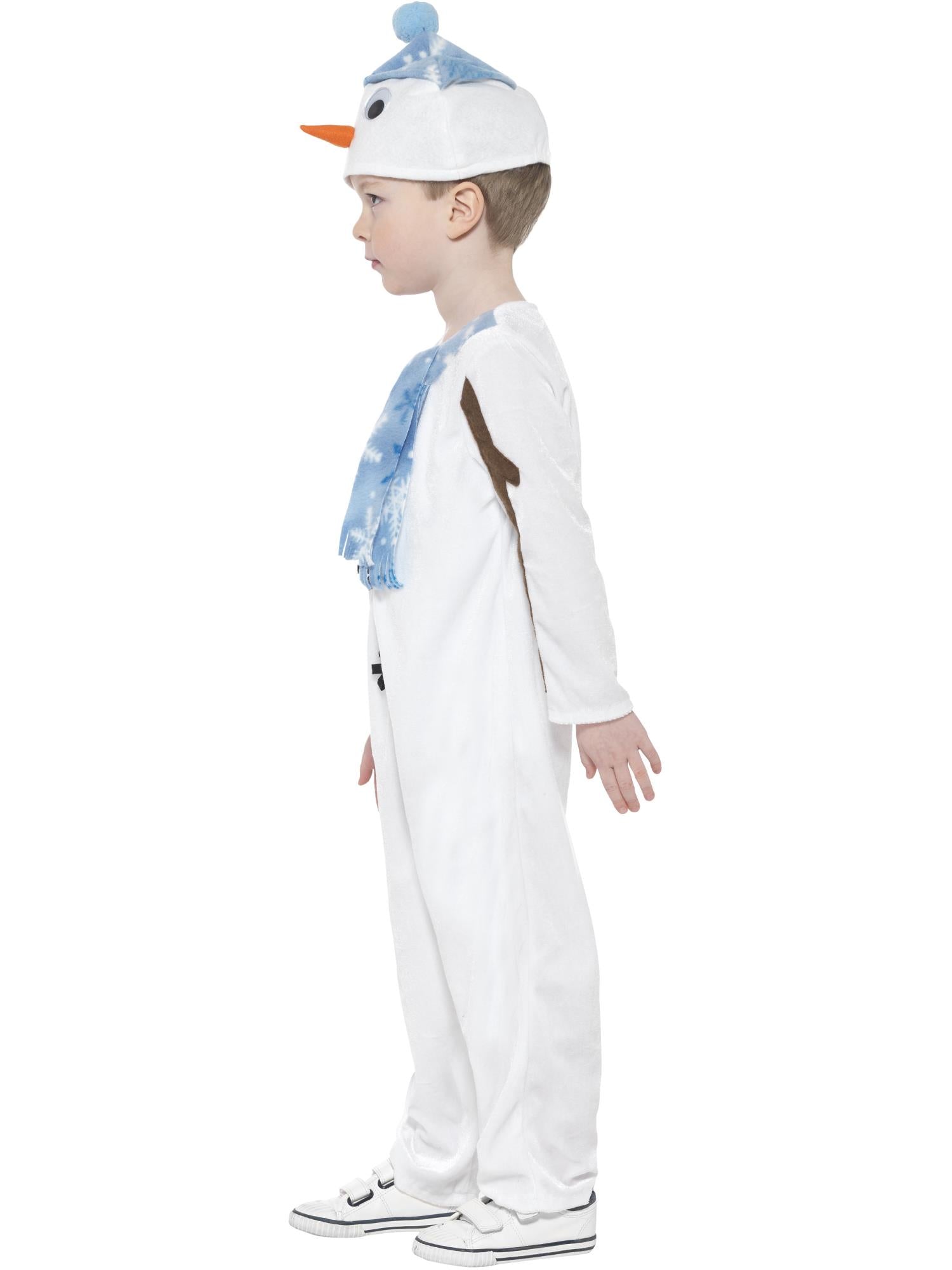 This white Snowman jumpsuit comes with blue scarf detail, black button detail, brown stick arm detail, and a blue hat with a pompom on top, googly eyes and carrot nose. This Costume is easy but effective, simply add shoes and your child's ready to play! Perfect for Christmas parties, school Christmas events and School Nativity performances, this Snowman Costume is sure to be a hit. This costume is unisex and available in a children's small, and toddler which is suitable for ages 3 -4 years.